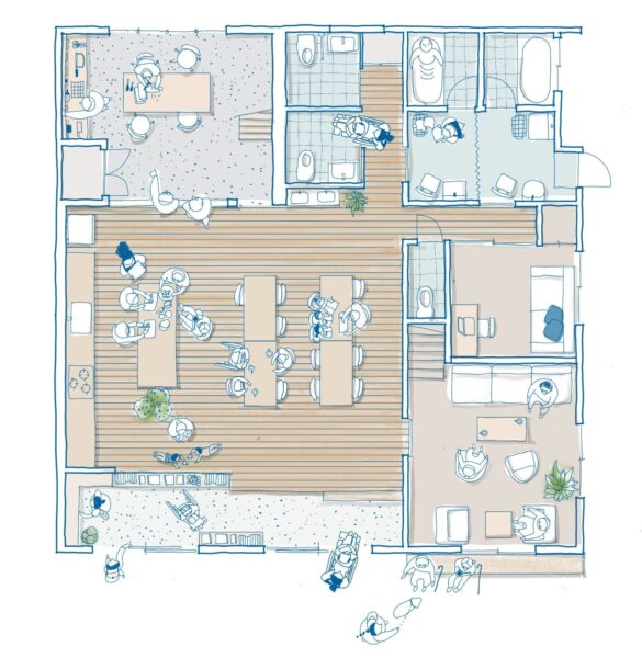 ラウンジは、静かにゆっくり過ごしたい人が選択できる空間です。これら3つの空間を自分の気持ちで選べるようにしたのが重要なポイントですね。ずっとポジティブな気持ちでいるのではなく、ネガティブな気持ちの方もいますよね。こういったネガティブになっている方へのアプローチは、中山さんが考えてくれました。