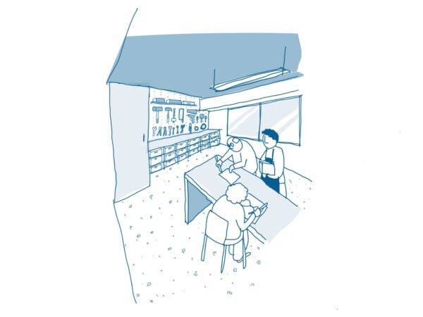 アトリエは少し奥まったところにあって、学校の図工室のようなイメージの空間で、ものづくりができます。壁には様々な工具が揃えられています。