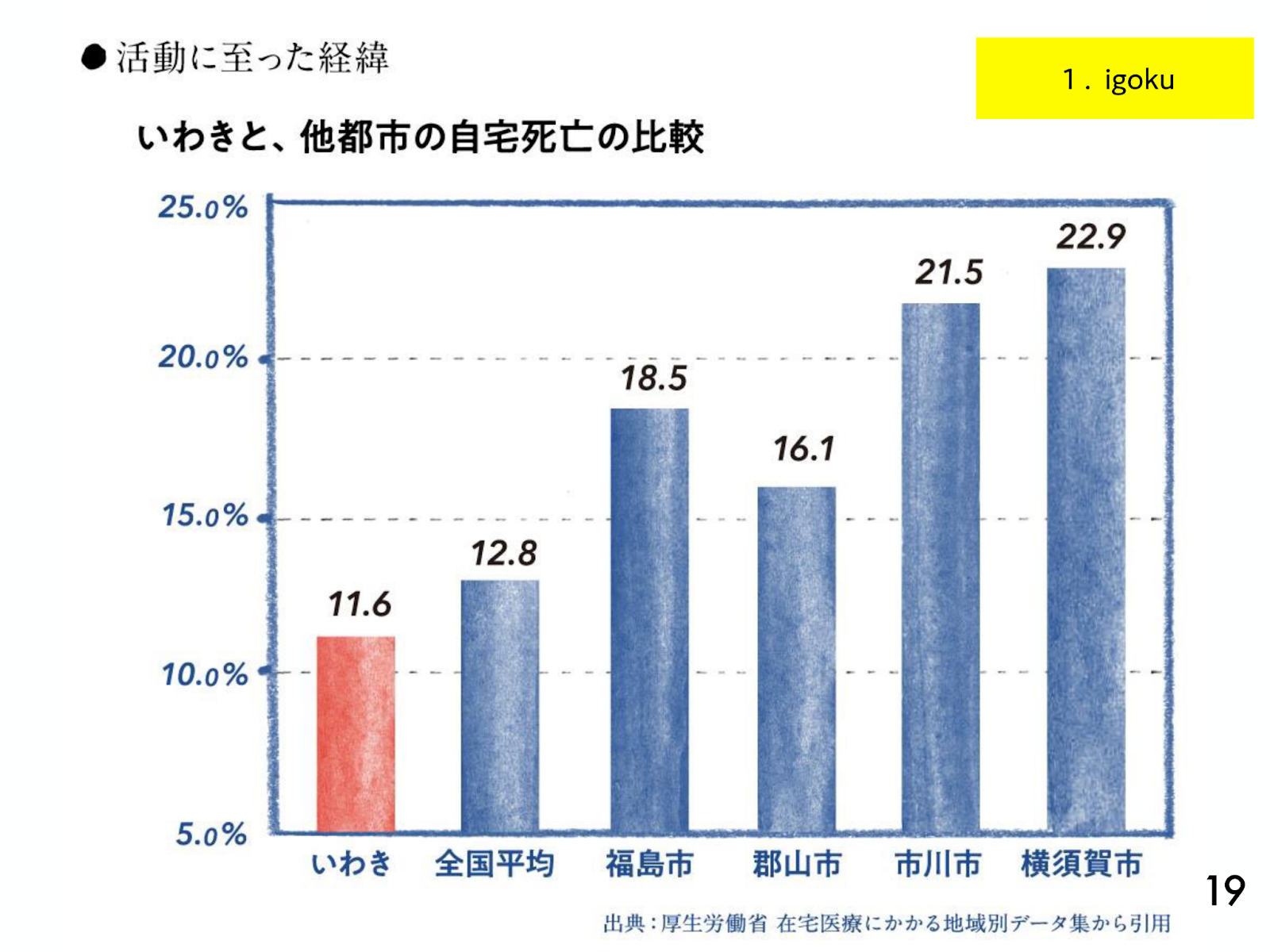 しかし現実は、自宅で亡くなった人の全国平均は12.8%。自治体別のデータを観てみると、いわき市は少し低く11.6%です。