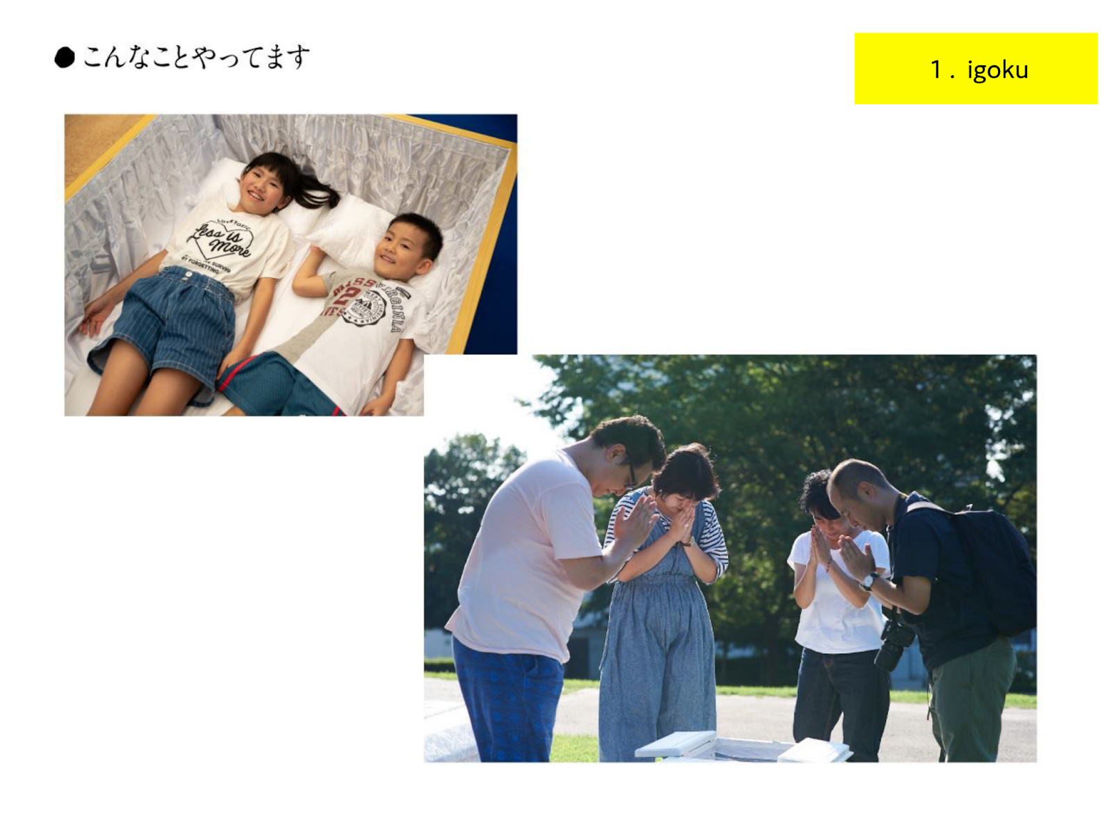 人生の最期を幸せな時間にするために、早いうちから最期について考えたり、話し合える社会を作りたい。また、高齢になっても施設に入らずに自宅で過ごせる、医療在宅介護などのサービスがあるという情報も伝えていきたいと考え、猪狩さんはigokuプロジェクトをスタートさせました。