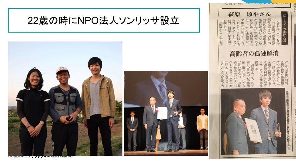 中学生の時に、突如祖父を亡くし、 祖母は配偶者の喪失と経営者の妻としての役割をなくし元気や笑顔を無くしてしまいました。 祖母を元気づけようと試行錯誤する中で祖母のような孤独を抱える 高齢者がたくさんいるのにも関わらず、行政・ 民間支援がほぼ皆無であることを知り、社会的な構造の課題や地域のつながりの希薄化など、 深刻な日本の問題として捉え、人生をかけ解決していくことを決意し、NPO法人ソンリッサ を設立。自然な笑顔で繋がる見守りサービスTayoryを開始し、ぐんま地域づくりAWARD 大賞を受賞。