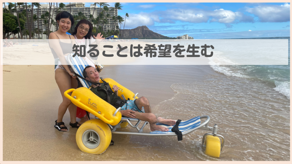 12年以上介護をするなかで、介護を支える制度やサービス・商品などはたくさんあることを知りました。2022年には当時要介護4の父を連れてハワイ旅行に行き、水陸両用の車椅子を使って父に海を楽しんでもらうこともできました。しかし介護を始めた当初は、そうしたサービスや商品を全く知りませんでした。私が大学1年のとき、父が病気を理由に退職勧奨を受けて会社を辞めざるを得ない状況に追い込まれました。本来であれば、健康保険組合からの傷病手当金制度を利用できましたが、知らなかったために父の年収分の金額を受給し損ねてしまったんです。