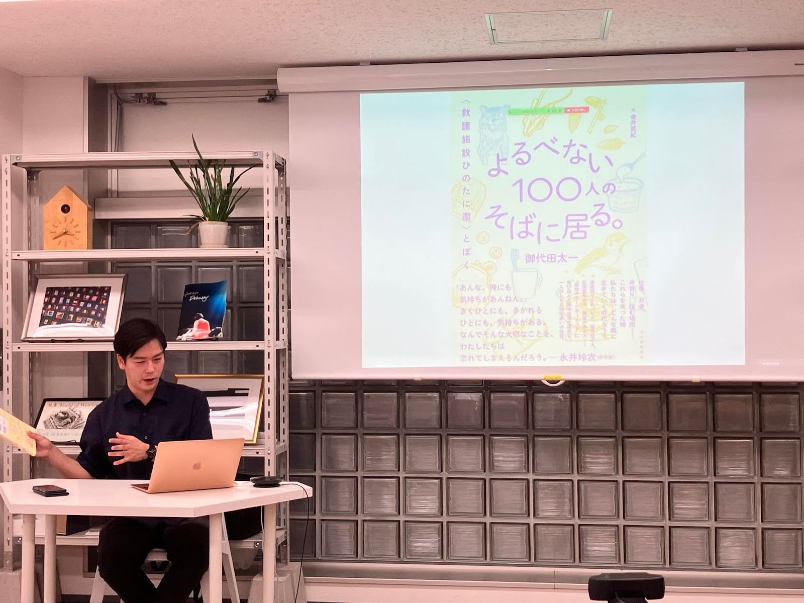 2人目は、御代田 (みよだ)太一さんです。御代田さんは大学卒業後に救護施設に勤め、生活支援員をしていました。救護施設で出会った仕事も、身寄りも、住まいもない人々の現状を発信し、2023年7月に『よるべない100人のそばに居る。: 〈救護施設ひのたに園〉とぼく』(河出書房新社刊)を出版しました。